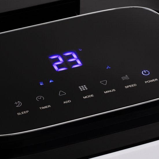 The unit has 3 adjustable functions: Cooling – Dehumidifying – Ventilating. The digital control panel features many options, such as sleep mode, timer, dehumidifier and child lock.